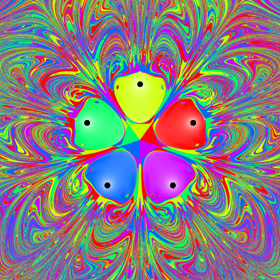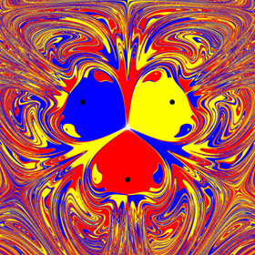 This chaotic strange attractor represent the final resting positions for a magnetic pendulum suspended over some magnets (shown as black dots). It kind of looks like mixed paint. The 2D animation shows what happens as you decrease the damping factor. The 3D animation was shaded by path length.